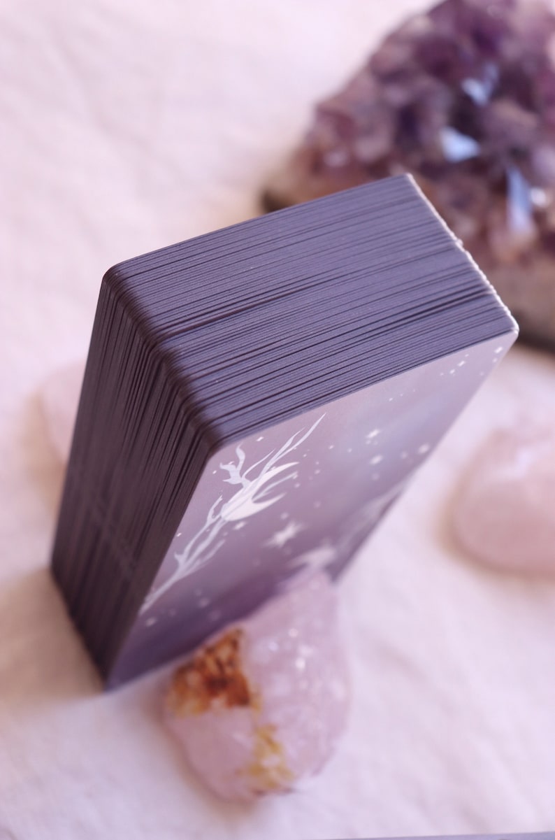 The cards themselves measure approximately 2.75in x 4.75in (70mm x 120mm). They are printed on a sturdy 350gsm paper with a luxe semi-matte finish (Some might call it a soft “rose petal” finish.) The edges are a matte purple color. The deck comes with a lovely box and 100 page guidebook which also arrives in the box.