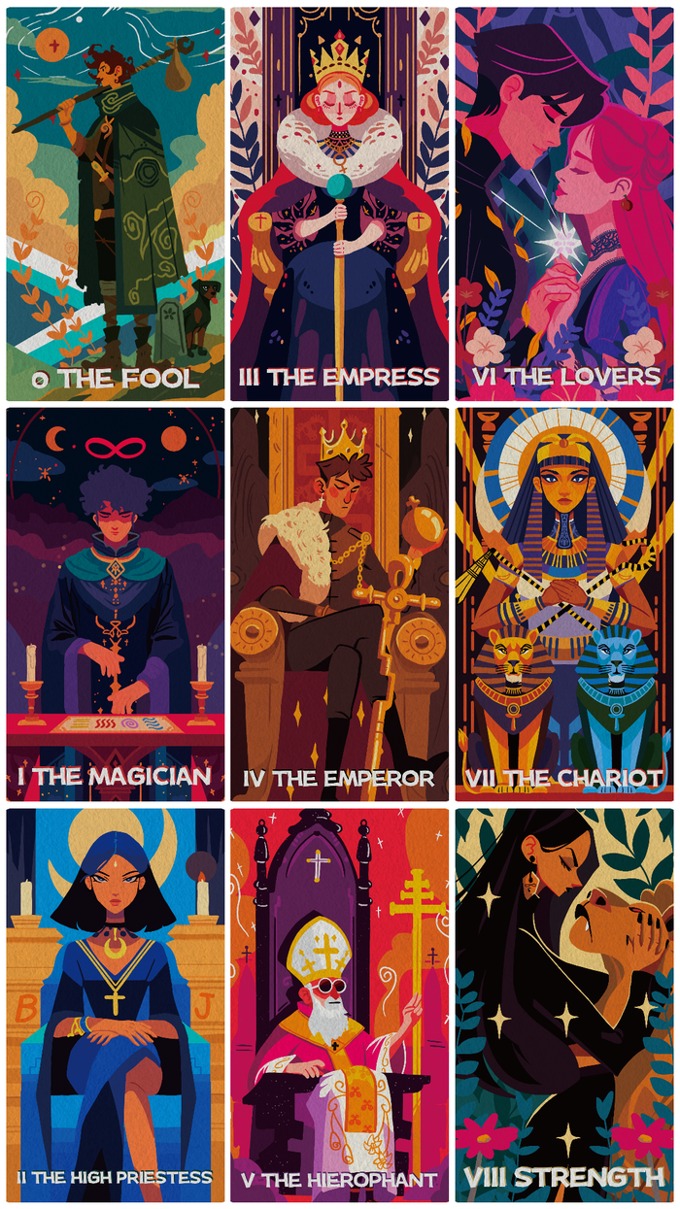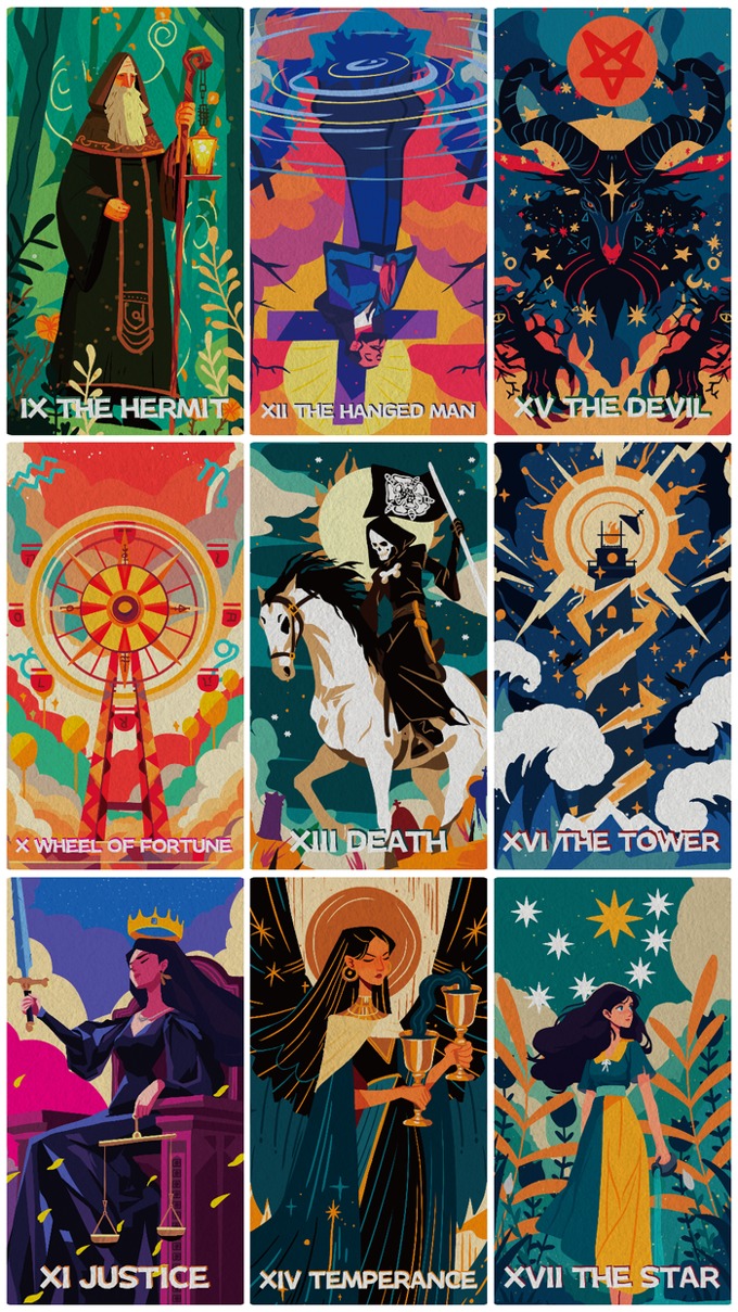 For our card design, we’re embracing a flat illustration style that balances bold, vibrant colors with a clean, elegant simplicity. Each card features a minimalistic outline, crafted to capture layers of meaning through subtle details, letting complex themes and symbols emerge without overwhelming the eye. Under the moonlight, life pulses, and dimensions intertwine, revealing a vast and mystical world. We approach it with humility, embracing the awe it inspires. In the illusion of time, love stands as our sole, unchanging truth.