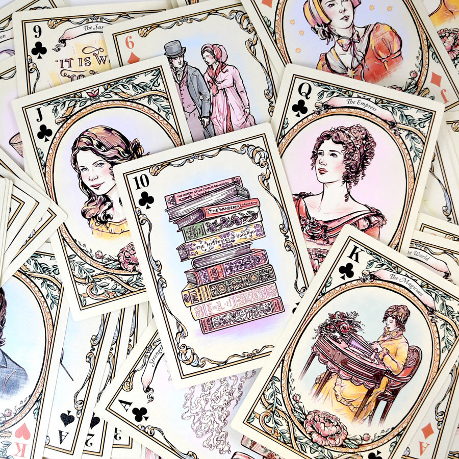 Noted Jane Austen artist Jacqui Oakley brings her beautiful work to the world of tarot with this sublime and whimsical package. Featuring 53 characters (including Elizabeth Bennet, Mr. Darcy, Elinor Dashwood, and more) and objects (such as well-trimmed bonnets and a stack of novels) from Austen's books, each card doubles as a playing card and tarot card. With Mr. Wickham from Pride and Prejudice as the Devil, a teapot representing strength, and Austen herself as the Magician, it's perfect for both longtime and new Austen fans.