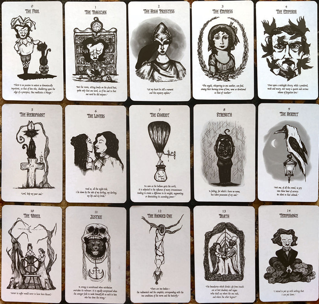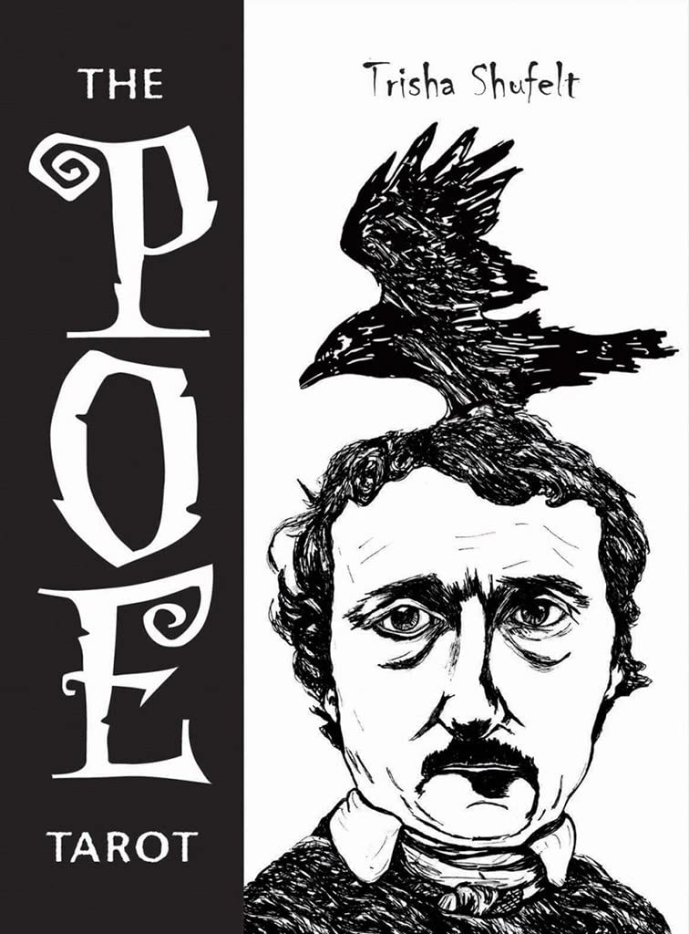 The Poe Tarot features the whimsical and, at times, macabre black-and-white illustrations by mixed-media artist/author Trisha Leigh Shufelt and quotes from the literary works and thoughts of Edgar Allan Poe. Images are directly inspired by such classics as The Raven, Annabel Lee, The Masque of the Red Death, and many more while utilizing traditional Tarot archetypes. The Poe Tarot follows Poe as the main character, navigating through the Fool's journey while diving deep into the subconscious realms to unveil what only he can through the wisdom of his works and the teachings of the Tarot.