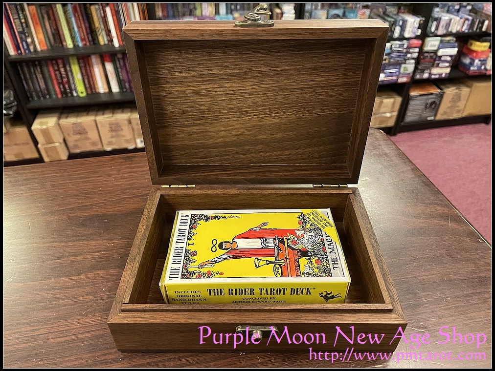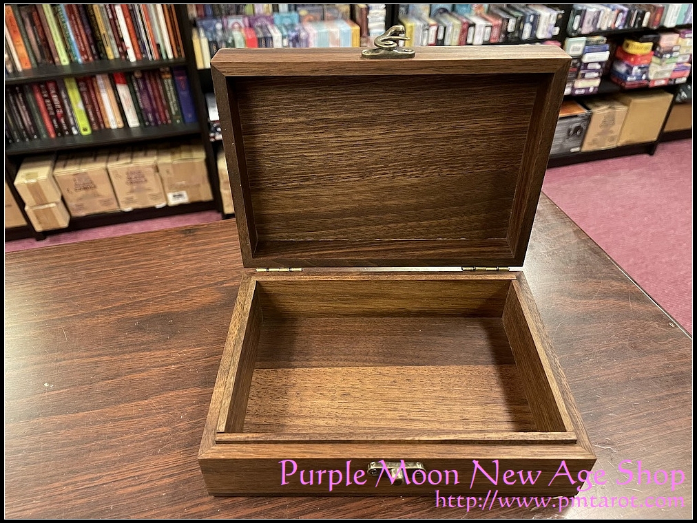 貨品介紹: This box fits all of the normal size tarot deck and even the large Thoth deck. Made of black walnut wood with brass latch hinges. The wood is well polished The boxes are also perfect for jewelry.