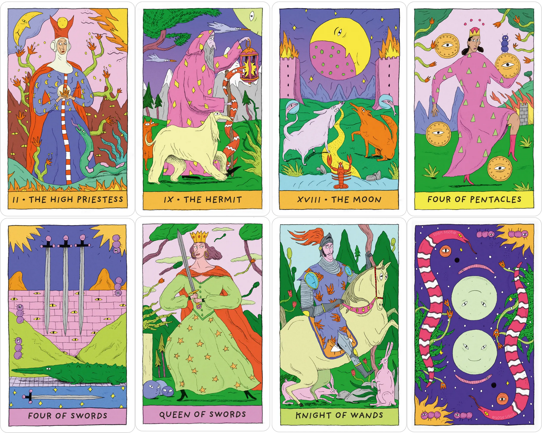 - Whimsical Artwork: Humorous, comic book style art; vibrant neon colors highlight tarot symbols and playful details