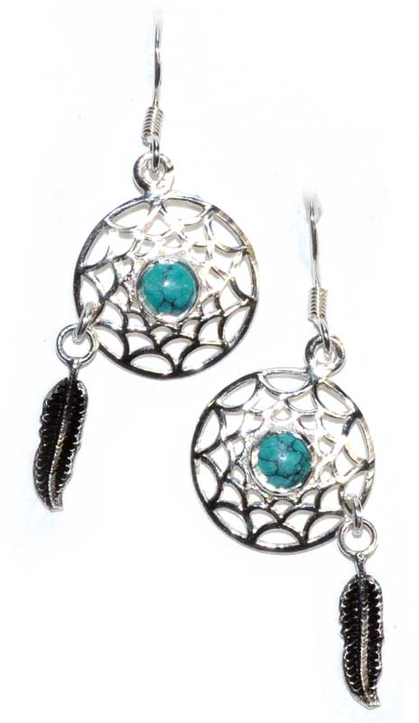 Sterling Silver dreamcatcher earrings, complete with a feather charm and a Turquoise stone. Turquoise may assist you with protection, courage, love, friendships, healing and is a lucky stone. 925 stamp and hangs 1 1/2" including hook. Made in India.