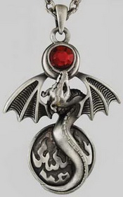 貨品介紹: Crafted from the finest lead-free pewter and hanging 1 3/4" long and 1 3/8" wide, this necklace makes an enchanting adornment to any outfit. Shaped into the image of a dragon at flight, the body of this necklace's pendant is the sinuous body and tail of that majestic winged serpent. Accented at the tip with a multi-faceted red gem representing the dragon's fiery breath, and backed by a 3/4" in diameter disk etched with the image of swirling flames, this piece is a potent charm or talisman for any seeking a deeper affinity with or understanding of the element of Fire.