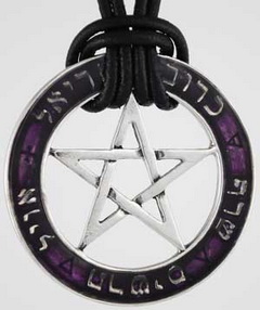 貨品介紹: The Sephiroth are the 10 attributes and emanations through which God reveals himself, and creates both the physical realm and the metaphysical realms, as spoken of within Kabbalah texts and traditions. Here we find them used to create a magical seal, in the form of a pentagram. With the interwoven star gleaming brightly in the middle, the circle around it is inscribed with these mystical markings, and are in turn encased within translucent purple glass, making this piece both a stylish piece of jewelry and a powerful magical charm. Hanging approximately 1 3/4" in diameter and is sculpted of English Pewter, it is suspended from leather straps that extend for approximately 28" in length, and close with a pewter clasp.