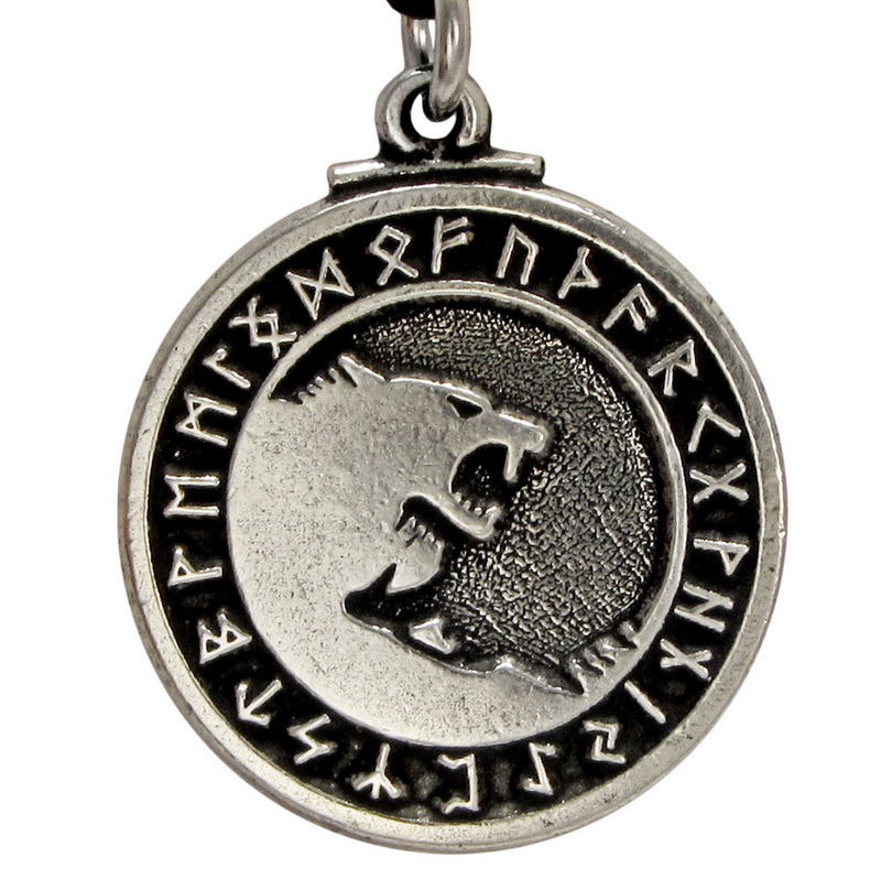 Our design shows the wolf in its dual Nature in a Yin/Yang-like design surrounded by the Magical Runes of the Vikings.