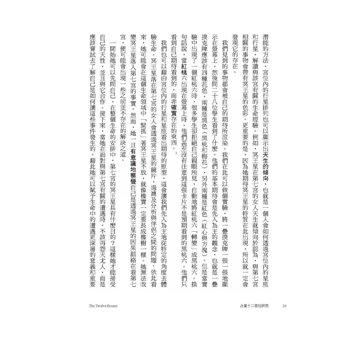 透過觀察星盤中宮位的行星排列,不僅可以知道面對該宮生命領域的最佳方式,同時也能洞悉內心天生的的傾向,一旦意識到自己天生的偏見,就可以在這個既有的架構內採取建設性的做法,一步步地擴張這個架構的界線,進而允許其他的可能性出現。