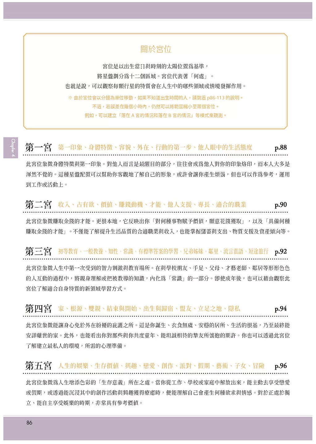 ‧十二宮位:指出情緒與事件容易發生的生活領域