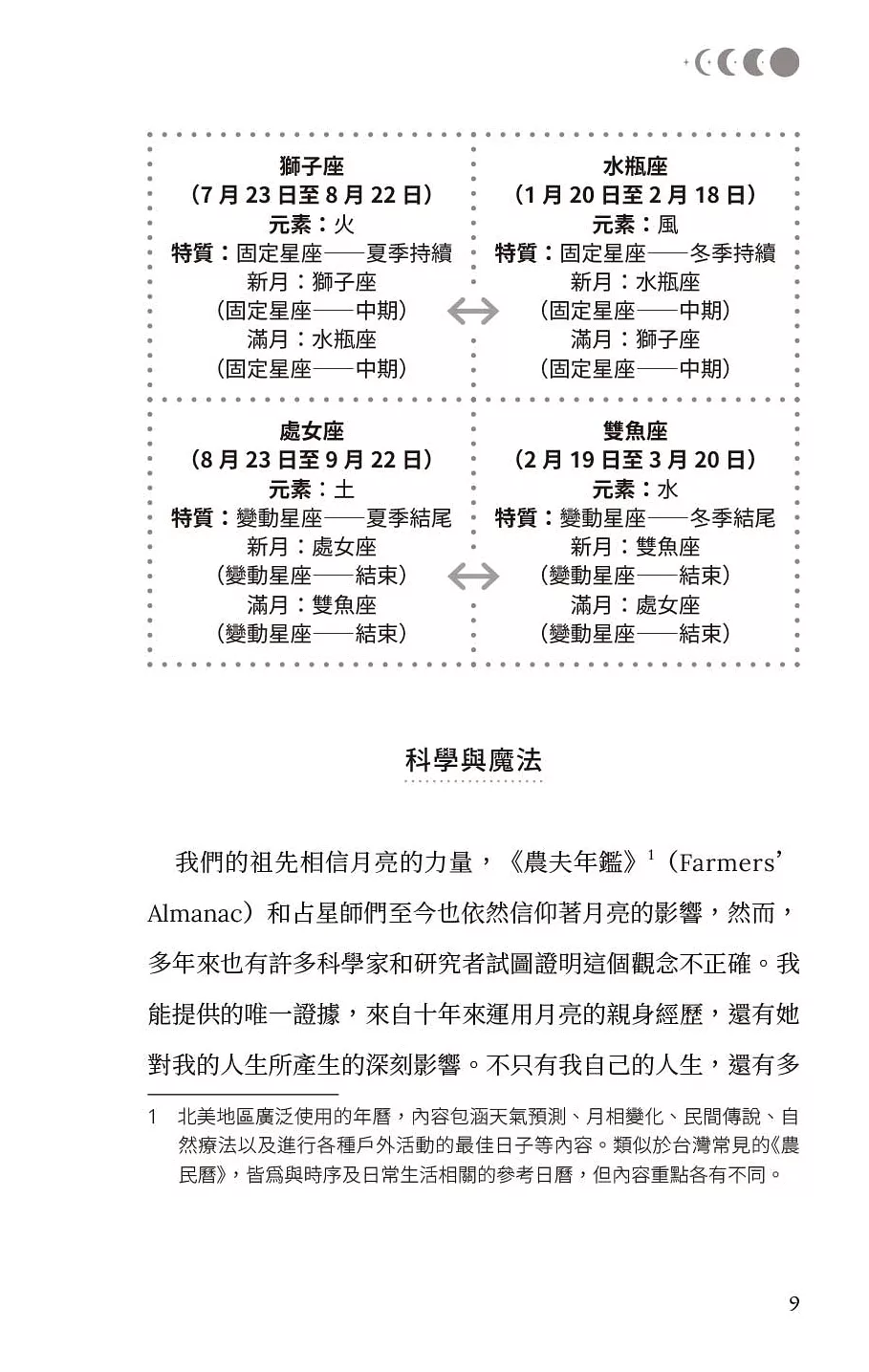 本書提供多種實用工具——從心願練習、肯定句與感恩日記,幫助你釐清方向、培養自愛與正向能量;並透過陰影書寫與鏡子練習,溫柔地面對情緒,整合自我。同時解析月亮落在十二星座蘊含的能量與課題,揭示新月願景與滿月釋放的最佳時機。