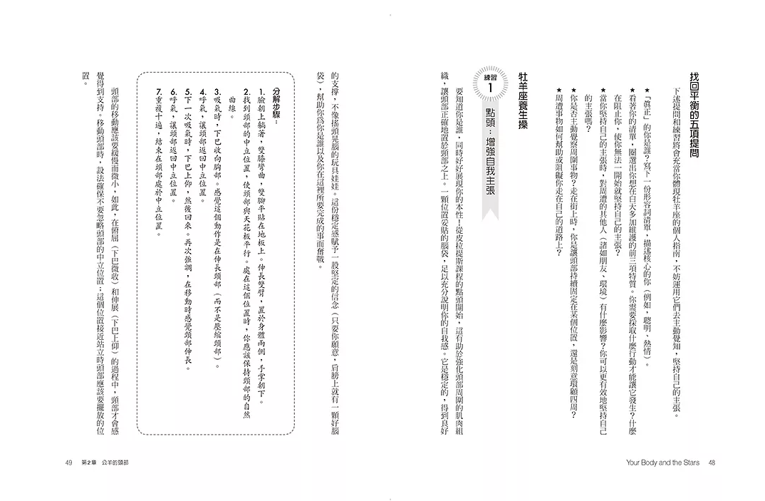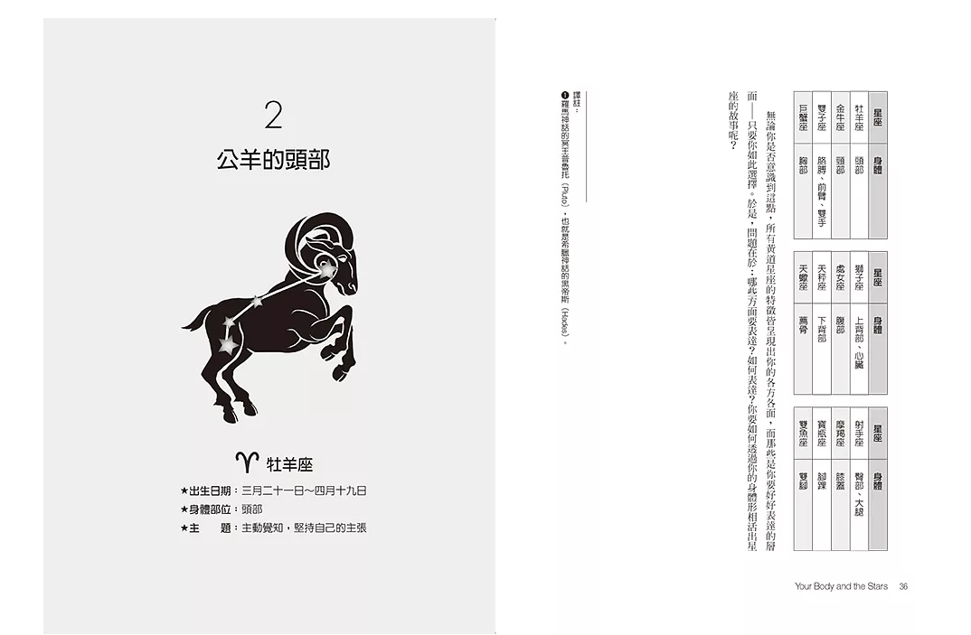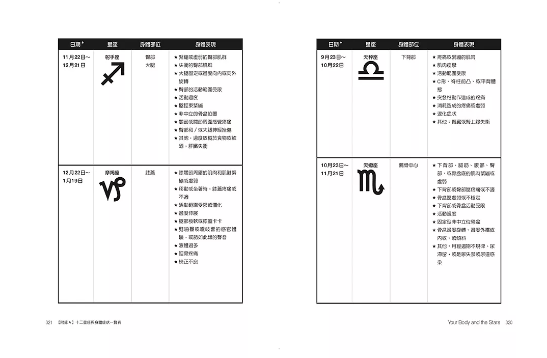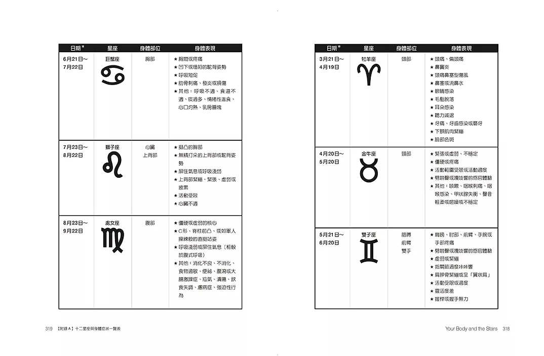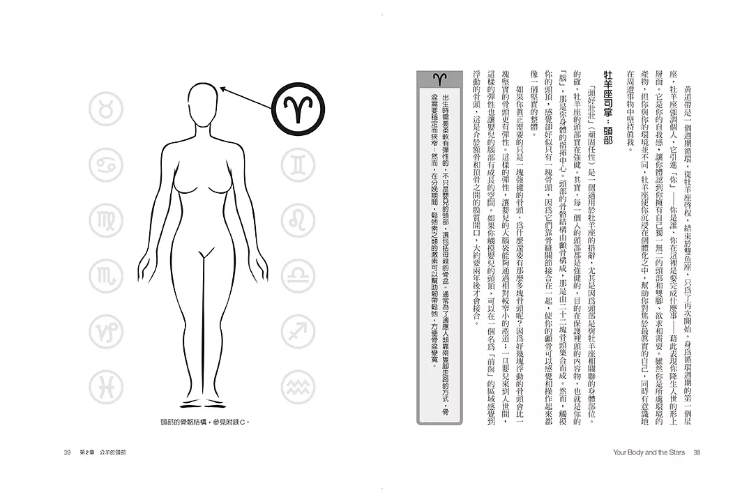 你可以依據自己的太陽星座、月亮星座、上昇星座(太陽星座影響力仍然最大),選擇閱讀的章節次序;也可以依據正受疾患所苦的部位,把本書當急救指南般隨時查閱。