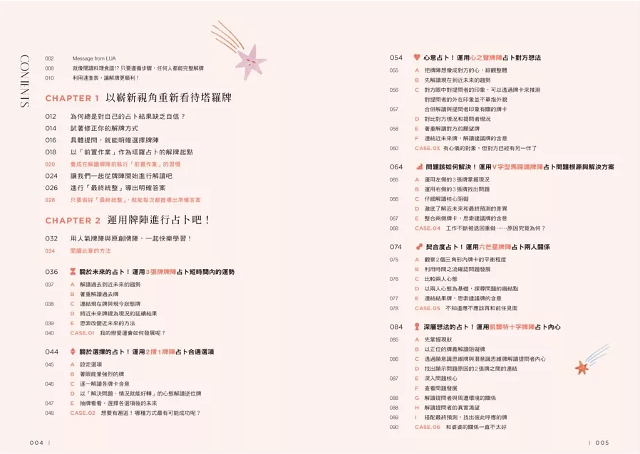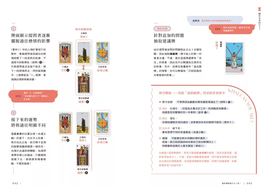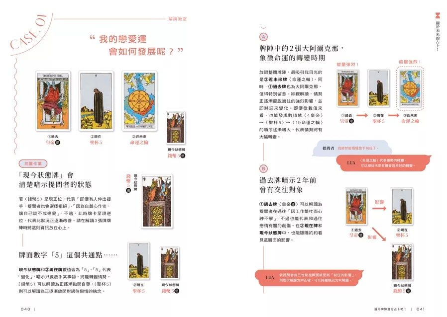 依照問題選擇適合的牌陣,並搭配重點提示與實戰案例,掌握多張牌的連結與關係。