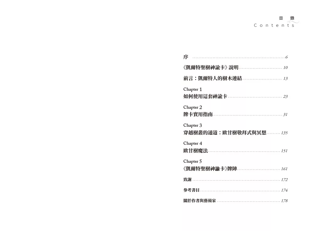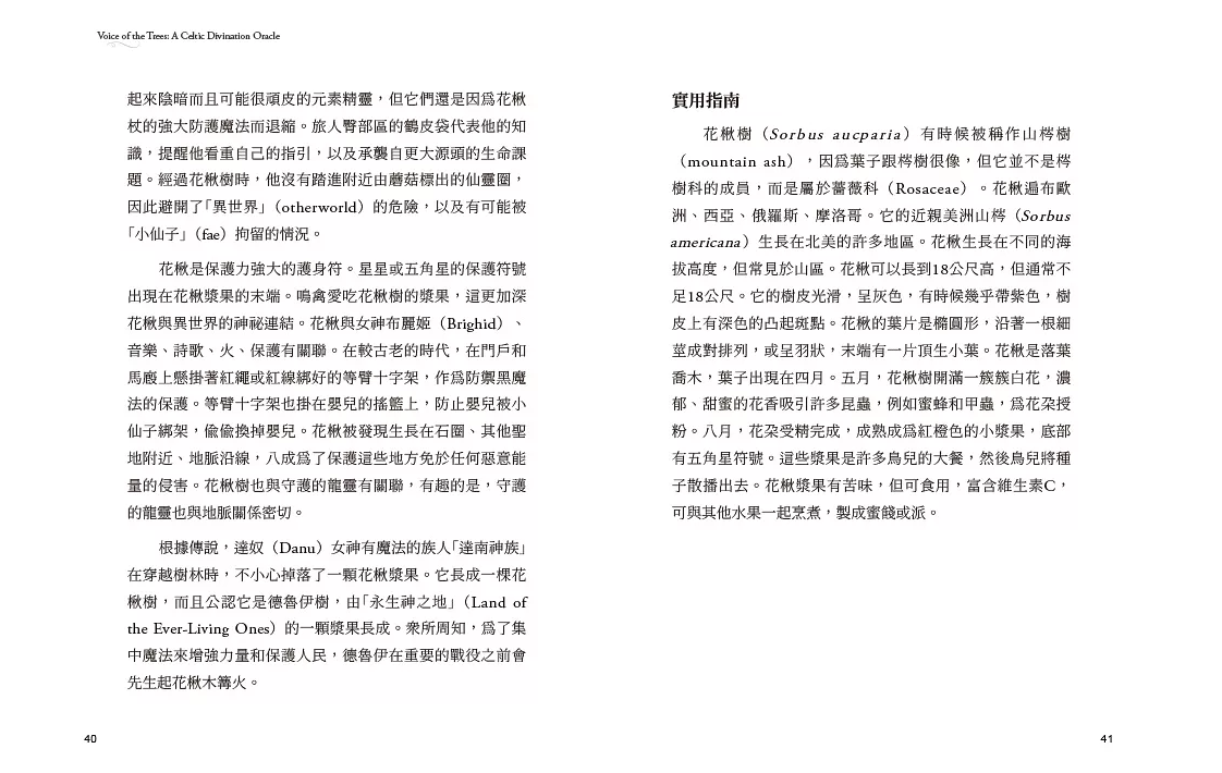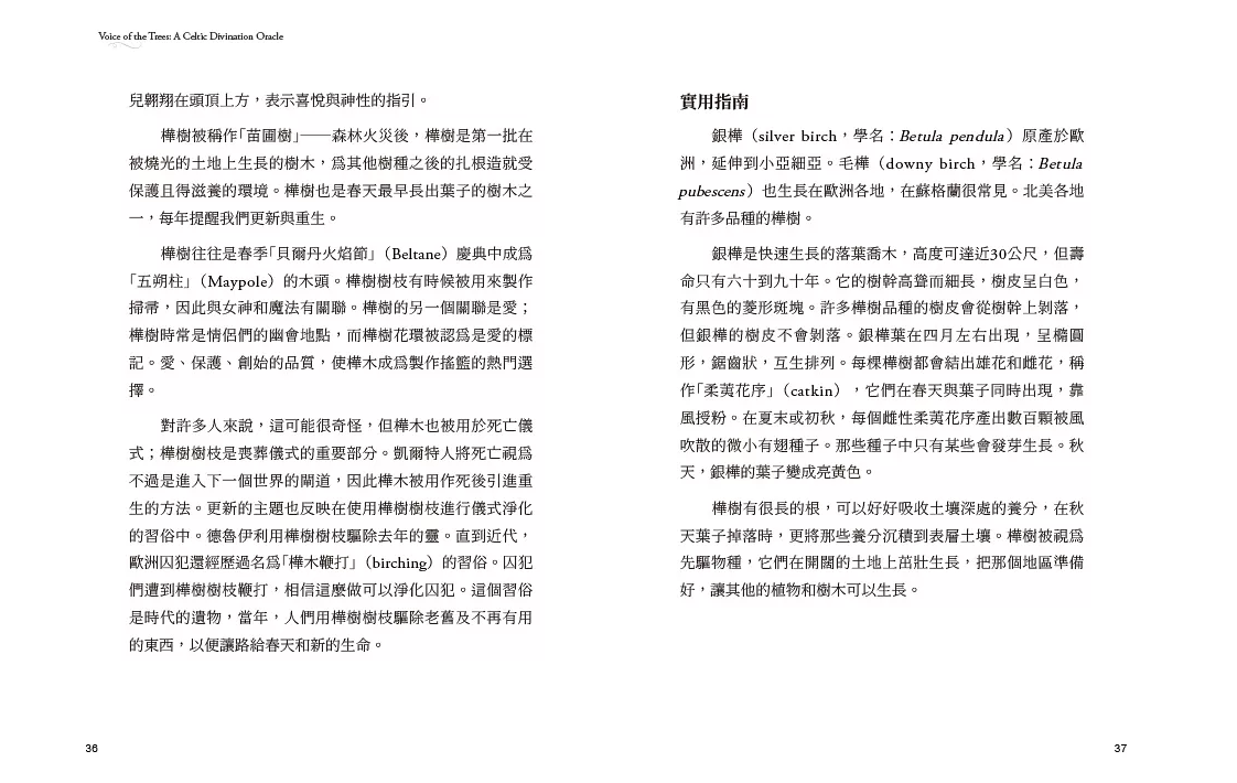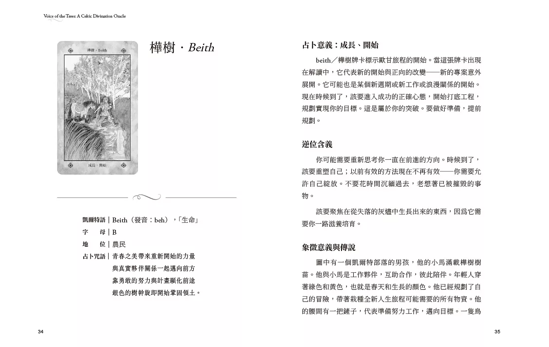 ◆針對25種聖樹分別列出:凱爾特發音、歐甘字母、地位、意義、逆位含義、象徵意義與傳說、實用指南;並加入一段占卜咒語,可用於進行更深入的冥想。此外,還提供了占卜時可用的牌陣。