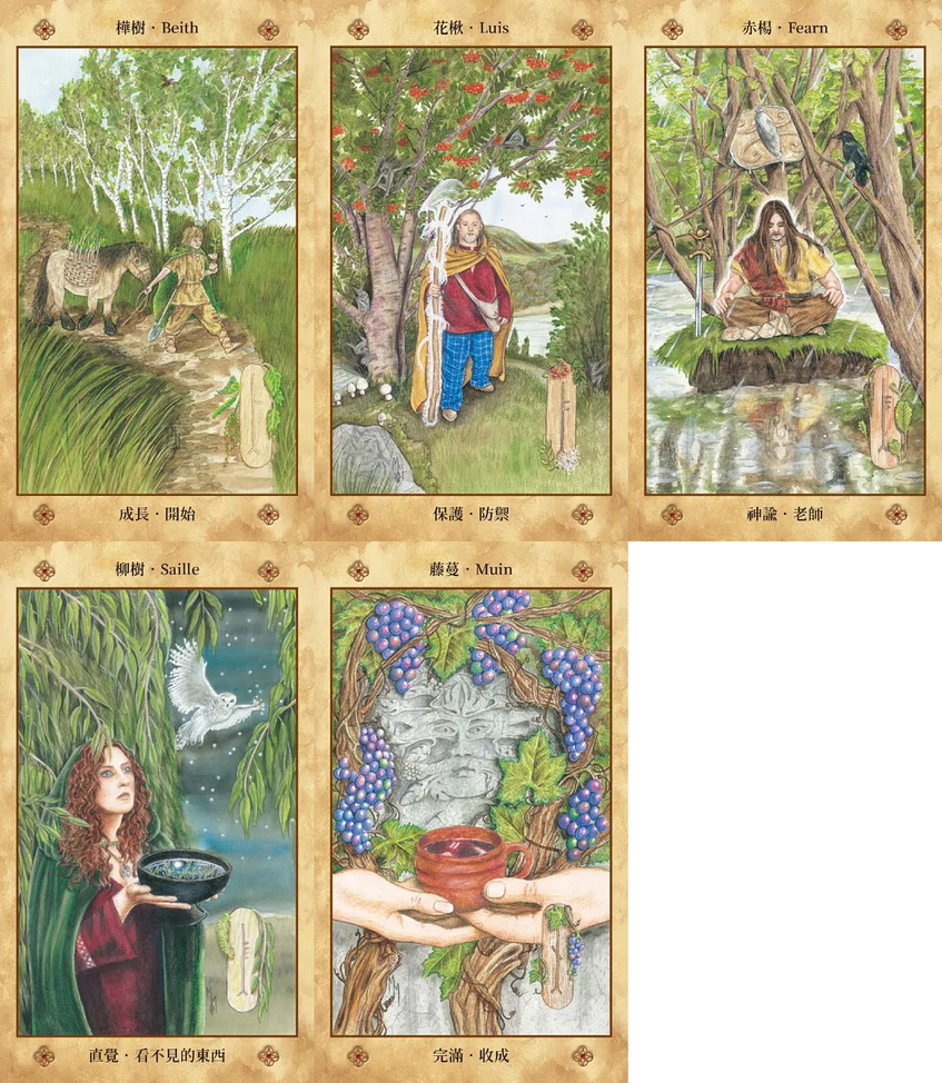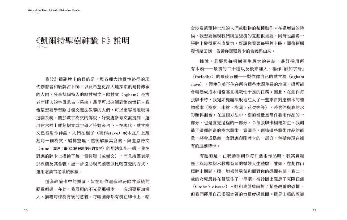 本套牌卡亦是探索凱爾特人歐甘樹文(Ogham)的入門磚,歐甘文是古老的字母兼占卜系統,最早可以追溯到四世紀。作者在隨附的解說手冊內,描繪了每一個符號(或樹文)及其樹木所代表的含義,進一步協助讀者理解並運用神諭卡的智慧。