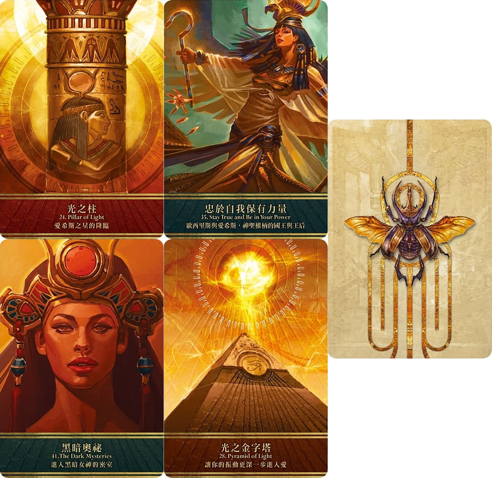 除了抽單張牌卡直接解讀外,另外有針對一個事件或問題的「何魯斯的金色太陽」牌陣,以及將你提升到新的領悟之境的「愛希斯之翼」牌陣。