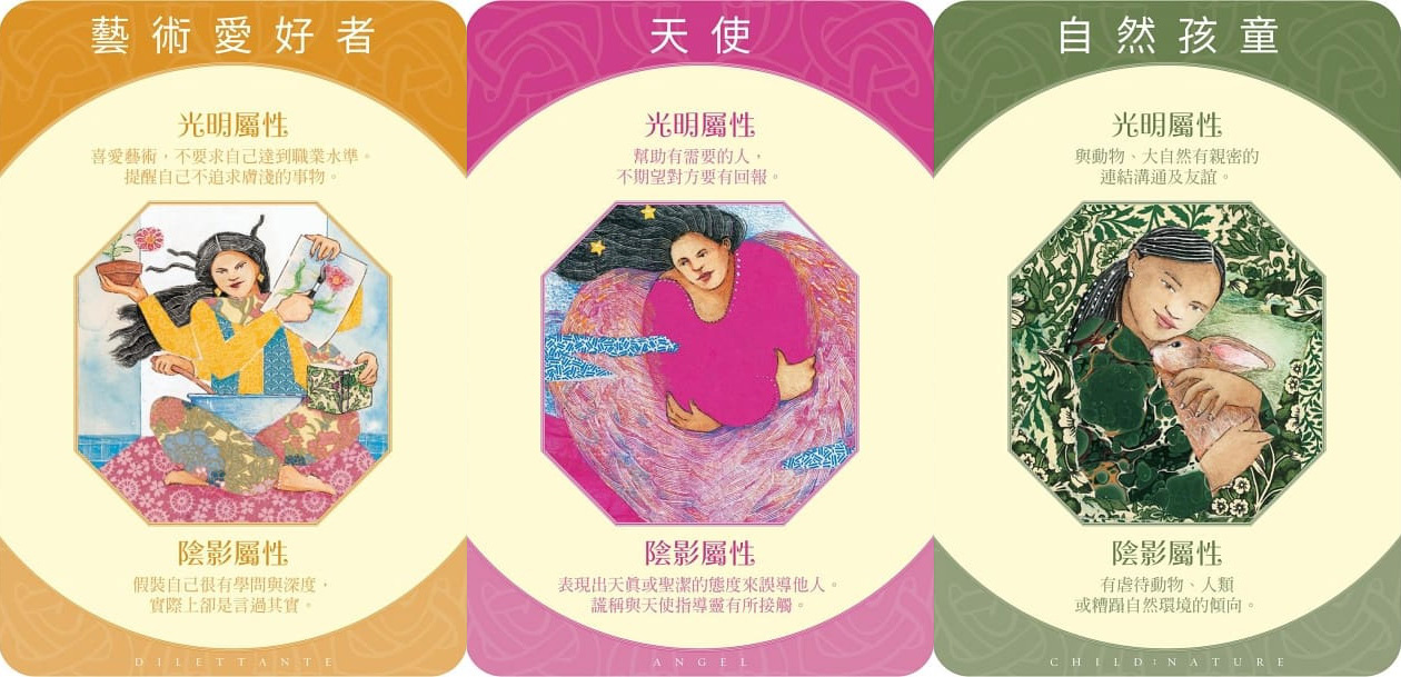 該如何理解這些原型?牌卡上的「光明屬性」與「陰影屬性」則有不同的詮釋。前者指的是這原型被你接納且發揮得當時的狀態;後者則是指這原型被你用在不適當的地方,並產生了非你所期待的效果。