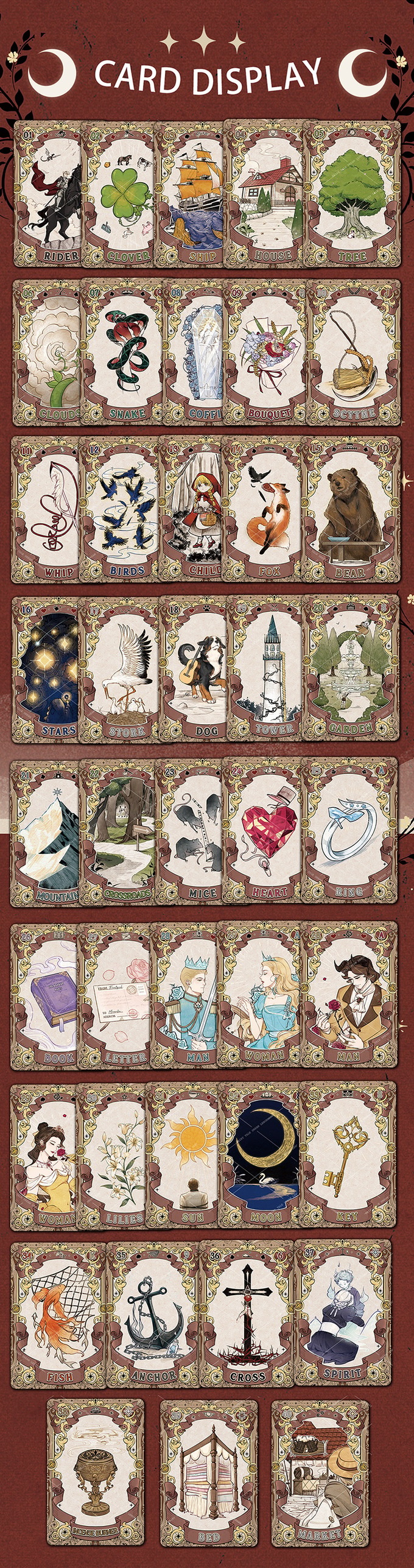 The inspiration for Fairy Tale Dream Lenormand comes from my endless love for classic fairy tales since childhood. On those magical and adventurous nights, my imagination soared in the fantastical world of fairy tales. These stories became treasures in my heart. Today, I've merged these fairy tales with Lenormand cards to create this set of vintage pen-style Fairy Tale Dream Lenormand cards. Each card contains elements of a classic fairy tale, such as the snake from "Snow White," the heart from "The Steadfast Tin Soldier," and the book from "One Thousand and One Nights." These plots and characters are cleverly woven into the card designs, and I hope that when you see this deck, you can feel the dual charm of divination combined with fairy tales, evoking warm memories deep within.