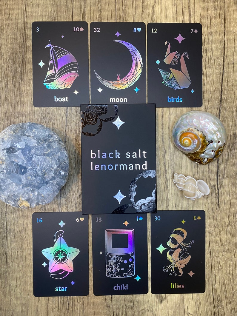 The Black Salt Lenormand is a 40 card divination deck designed to captivate and illuminate. Its cards feature black backgrounds, holographic silver foil artwork, and matte black card edges. Perfect for Lenormand beginners and experts alike. Comes with a foldout of card meanings.