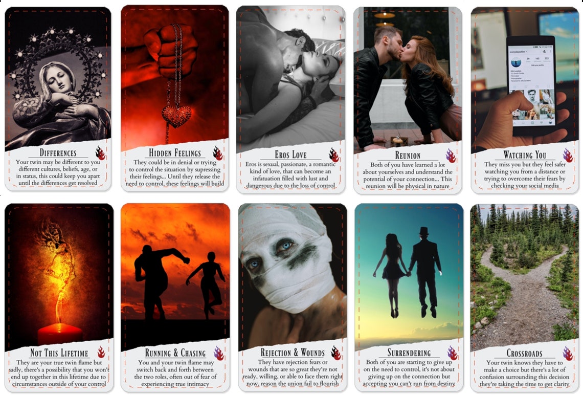 So for a long time I was resisting to do a love deck unless I found a way to create it in such a way that I found it to be less romanticized and more grounded. I believe many of us get stuck in believing we are in a twin flame connection because their behavior patterns could also reflect that of a Karmic or a connection that really does not exist. Every deck I create comes from a place of reality to help people really understand the meaning of their connection, So... with that being said, I found a technique that can help you figure out if you are truly in a Twin Flame connection, Soulmate or Karmic connection. Each card contains a flame symbol, Black represents a Karmic Connection, purple a Soulmate Connection and lastly A Purple and Red or Black and Red Flame meaning Twin Flame... When you pull the cards, the dominating colors of the flames will be reflecting what kind of connection you are in, and even if you are in a Twin Flame connection, we must understand that it is possible not to end up with them in this lifetime so for that I also included a black and red flame to represent the toxic Twin Flame Connection. The more black you have, it could very likely mean you will not end up with your Twin Flame or black only it is likely you are with a Karmic. The more Purple flames you are in a Soulmate Connection and of course any double flame is a Twin Flame connection, more Purple and Red flames it is likely you will end up with your partner and more black and red it is likely you wont.