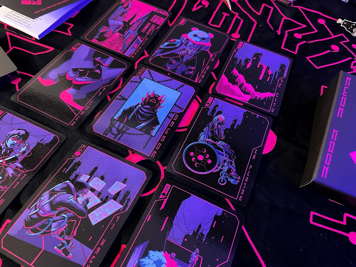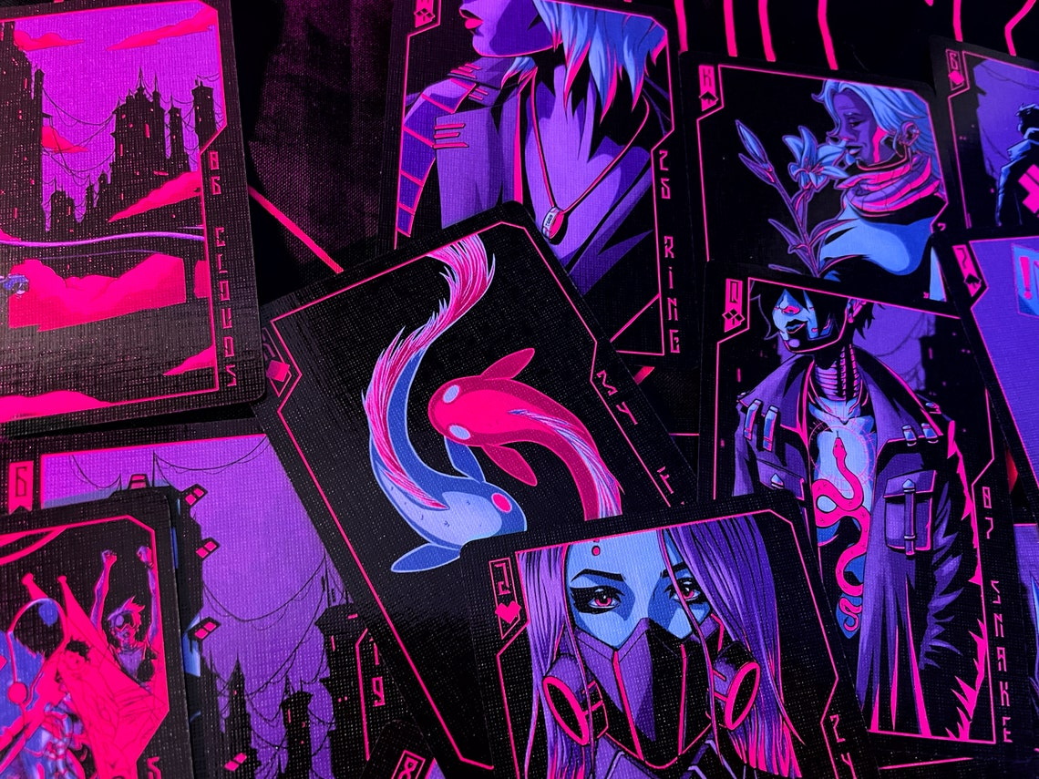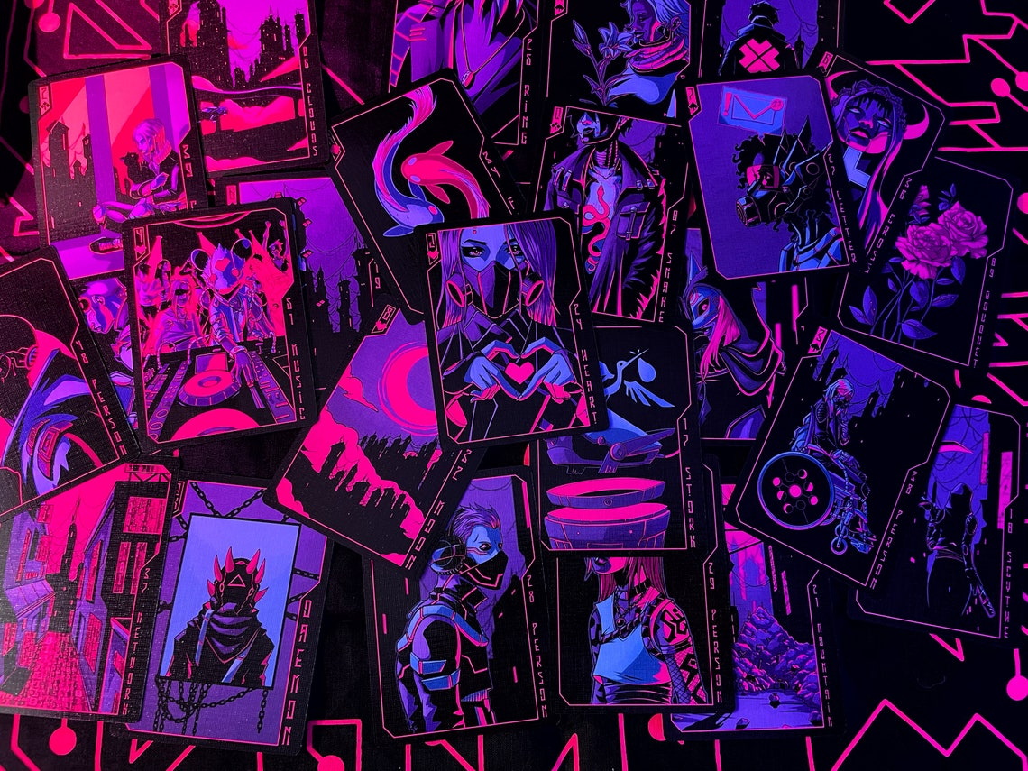 The Neon Moon Lenormand is an expanded Lenormand deck with 54 fully illustrated cards set in a retro-futuristic cyberpunk world using the archetypes and themes of a Lenormand deck. Cyberpunk themes introduced in the Neon Moon Tarot continue throughout this deck which could be used as a companion deck alongside it or stand on its own.