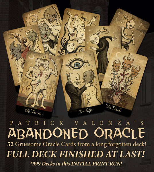 The Abandoned Oracle began as a small collection of inked nightmares pulled from the pages of Patrick Valenza's dream diaries, however, the deck was abandoned in 2015 in favor of more urgent projects.