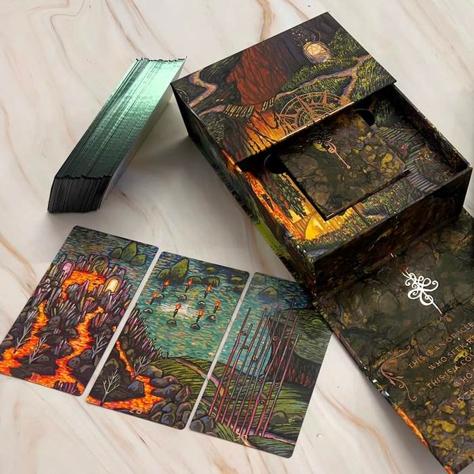 This oracle can be used as a Tarot deck, a Numerology deck, and a map to a lost world. It includes a 100-page guidebook of field notes and lore to this forgotten land. Within the guide is everything you need to embark on an expedition of many paths.