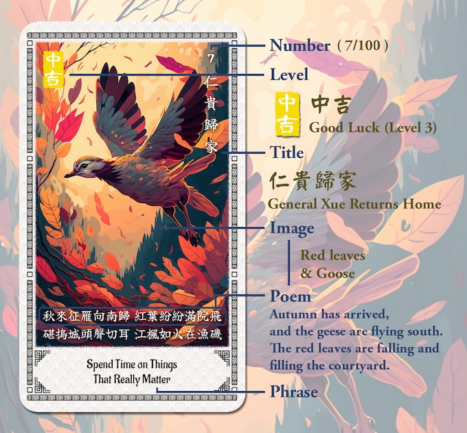 The Oracle card is composed of several elements designed to help the user interpret its meaning. These include the Number, which helps you find it from the Guidebook. All our cards' numbers are the same as the original Wong Tai Sin Chims. The Level indicates the level of fortune. The Title is a brief description of the card's poem. The Image is a visual representation of the card's meaning and the poem itself. Finally, the Poem is the original Wong Tai Sin Kau Chim poem and provides a unique message that is related to the question asked.