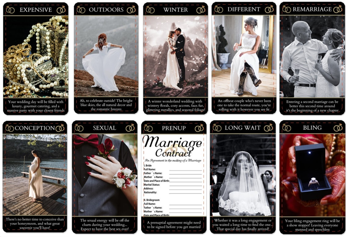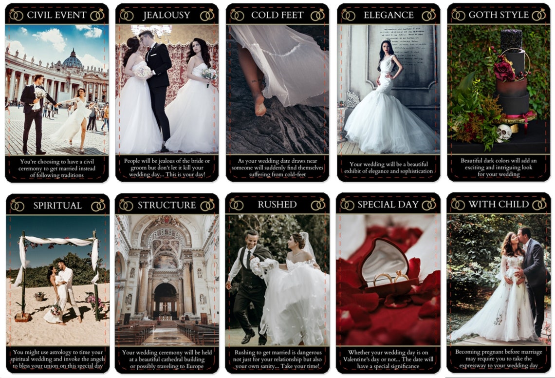 Ever wondered what your future wedding would be like? Well, now you can :) I created this deck with all the possible scenarios and styles that some might have when having a wedding and yes even if the single life was chosen instead of being married.