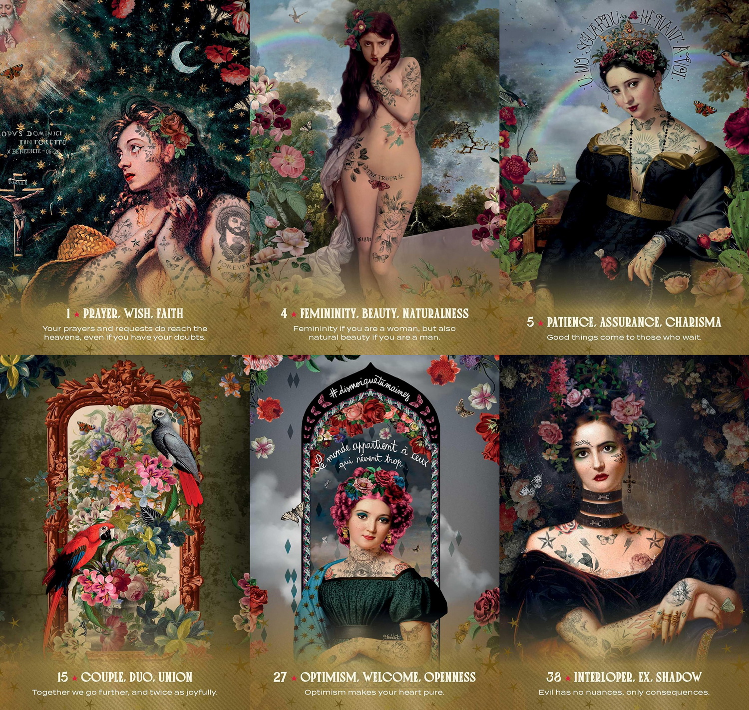 This beautifully illustrated love oracle features classical imagery with a modern twist—all the collaged figures showcase stunning and modern tattoos.This luxurious deck includes 44 stunning cards that provide guidance, messages, and inspiring answers to questions about affection, emotions, and love.
