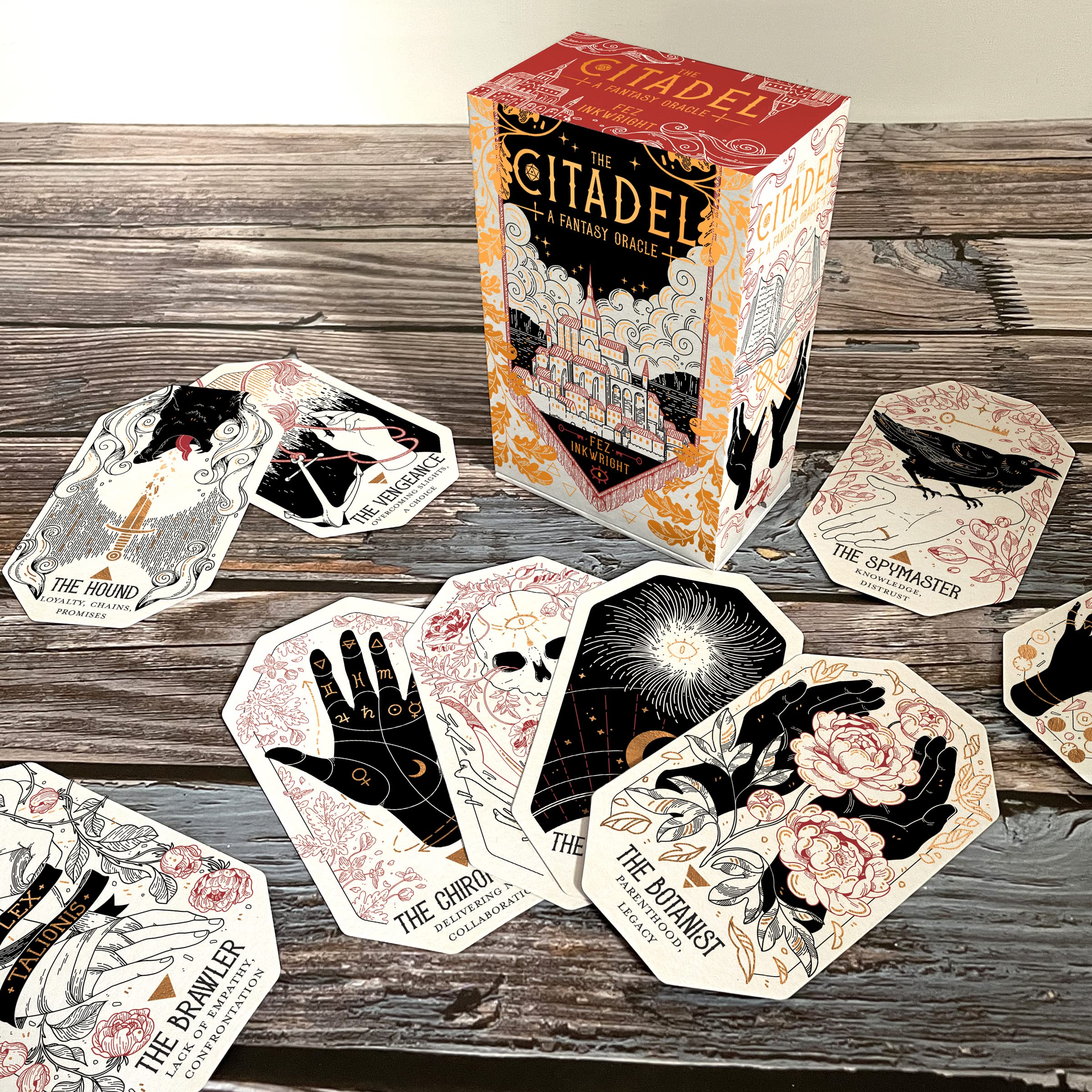 The second deck from bestselling author and illustrator Fez Inkwright, The Citadel is a fresh take on oracle decks that is seeped in the magic of fantasy literature, Tolkien's Middle Earth, and tabletop gaming—a truly unique combination of storytelling and cartomancy! Each of the 60 cards in this deck represents a person living within the Citadel. The guidebook describes different scenes that the reader will encounter while traveling through the city, including the stories of each character and the interpretation of each card.