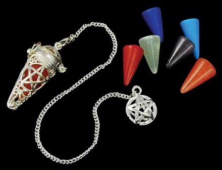 貨品介紹: This elegant pendulum uses the symbol of a pentagram to create a silver tone cage. This cage is intended to contain one of the seven stones provided, helping to add its energy to your divination. Try each stone out and explore all of the answers that you'll find.