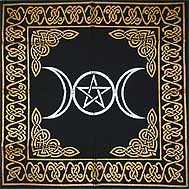 貨品介紹: This charming cloth, is perfect for the medium sized table or altar and great for wrapping your tarot deck A silver triple moon symbol of the Goddess with a pentacle and golden Celtic border boldly jump off of the black background, instantly catching ones eye. The edges of this cloth are tasseled, extending beyond its overall width of 24".