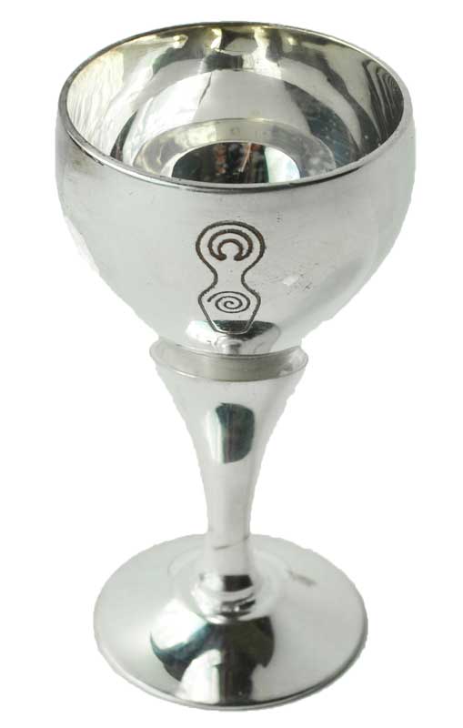 A silver chalice with a goddess figure carved on the cup