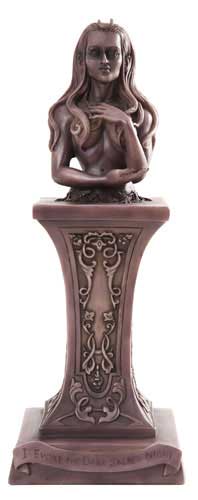 A classic design inspired by the works, practice and art of Raven Grimassi and Stephanie Taylor. This bust shows a naked woman covered only in her hair, crowned with a Crescent Moon and wreathed at the waist with leaves, flowers and vines. She is supported on a beautifully carved column that bears the inscription "I Evoke the Dark Sacred Night" on the front and Raven and Stephanie's names on the back. Cold Cast Resin