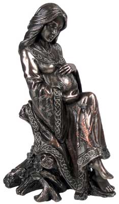 A beautiful statue of the Mother aspect of the Goddess, shown here seated comfortably on a wooden stump seat glorying in her full pregnancy; delicate highlights of color are added to accent the bronze undercoating. Cold cast resin.