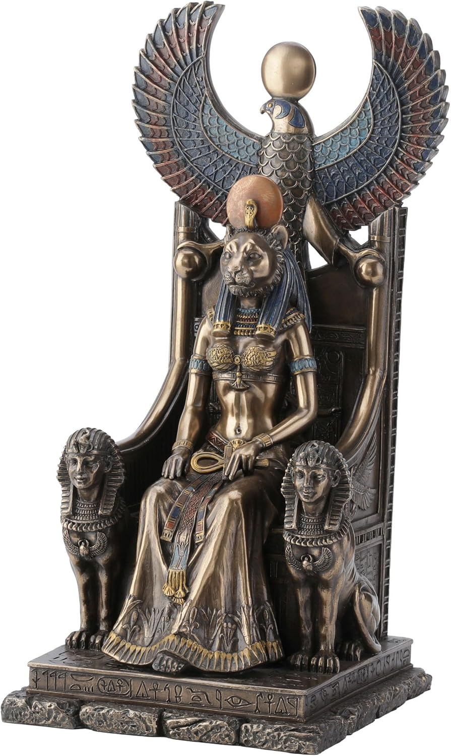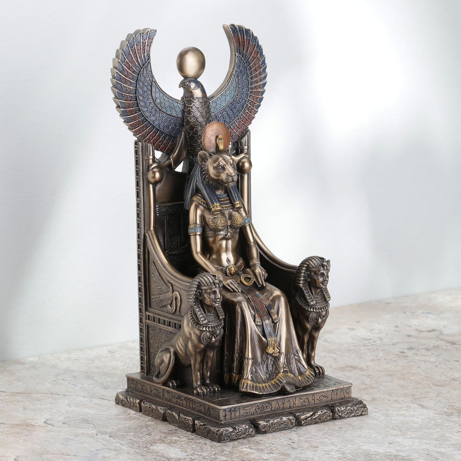 Sekhmet, Egyptian warrior goddess of healing, led the Egyptians fiercely into battle. Her ferocious lion visage attests to the courage and brutality of her spirit. In this gorgeous depiction, Sekhmet reigns from her throne as protector of pharaohs. Her adornments, crafted in stunning detail, all establish her as Egyptian royalty. She wears a uraeus diadem which represents divine authority. She wields a long crane-headed staff of earthly sovereignty in her right hand and the ankh symbol of eternal life in her left. Beautifully crafted from cold cast resin, this statue looks and feels like a genuine Egyptian artifact with a bronzed color finish and blue/gold painted accents. A perfect size to show off in any book shelf or display cabinet, the statue measures 11 inches tall, 5 inches wide, and 5 inches deep. According to legend, Sekhmet created the desert with her breath. We can`t guarantee she won`t turn your home into a desert but she will certainly adorn it with an elegant Egyptian accent.