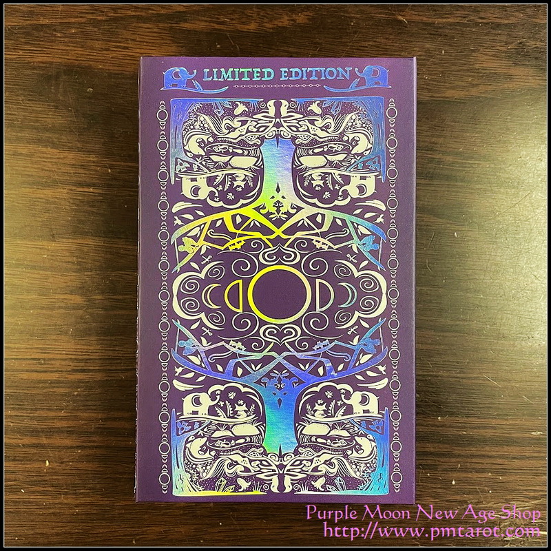 The collectors edition comes in a magnetic clamshell box with holographic foil accents. The size of our cards are 3.25 by 5.5, which is larger than your typical tarot size so it can show off the beautiful art more vividly. The weight of the cards are 350 GSM (for easy shuffling) and they are beautifully gilded in matte purple with a satin finish that makes the cards easy to shuffle but not have a glare when light hits it, which can be very distracting during a reading.