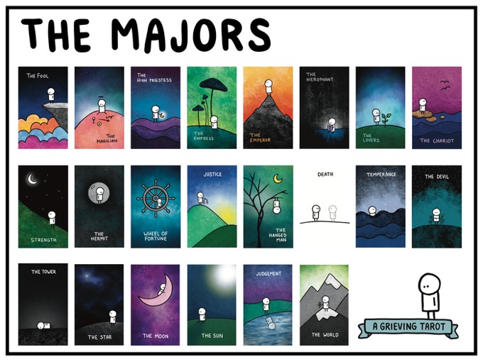 A Grieving Tarot is absolutely not a how-to guide for using tarot through all losses. These drawings, and my words, are not here to tell you how to live your own wild and personal grief. It is simply a gentle reflection of my own experiences and interpretations, as I’ve walked my own grey path. It is my hope that it finds the right people, and that maybe it can be a gentle way to introduce more grief-informed perspectives to your readings.