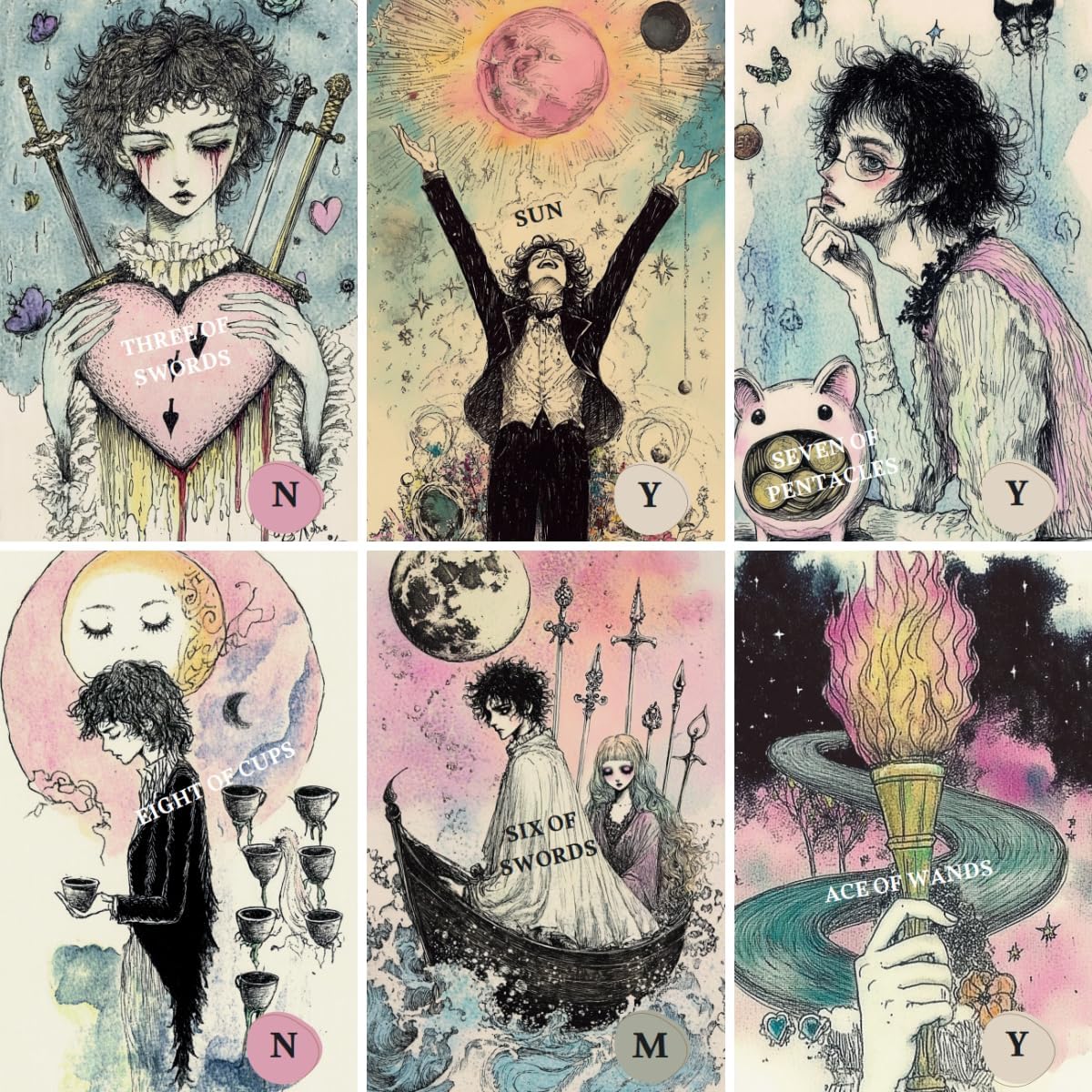 許多初學者在進行戀愛占卜時,常面臨「明白牌義卻難以轉化為具體情感」的困境。本作透過直覺化的視覺設計與專屬解說書,打破解牌僵局,讓情感流動變得自由且清晰。
