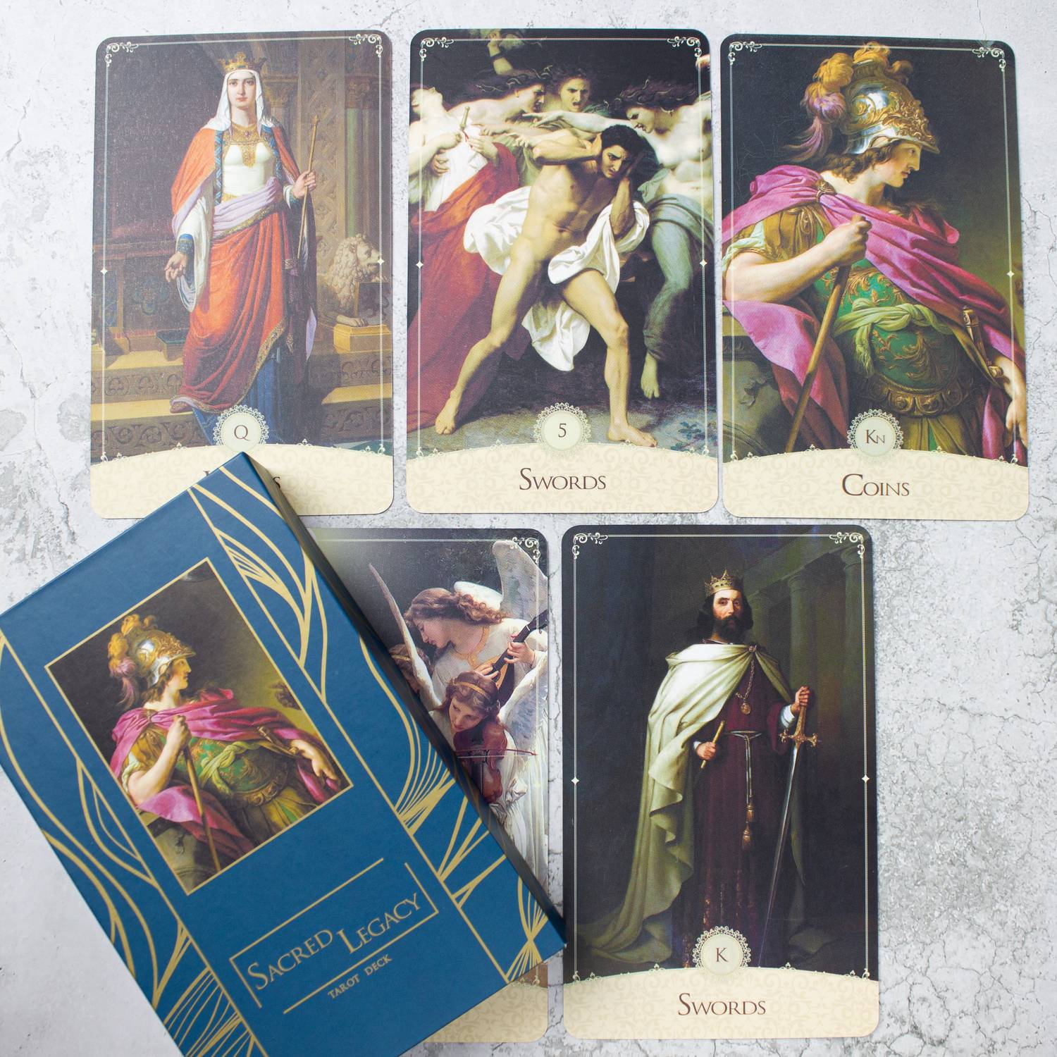 The “Sacred Legacy Tarot” deck consists of 78 cards covered with a protective coating and a guidebook with keywords.