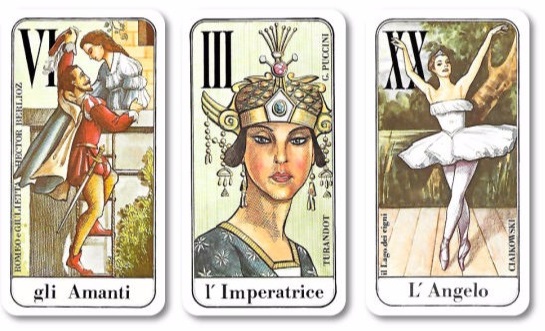 主題:音樂世界。 Menegazzi 製作的這一副牌是在與 Paola Maino 協商以及Giovannino Scarsato 的合作下完成的。正面光滑,背面純色。卡牌上的標題是意大利文。這套大秘儀中的每個角色或場景都是在對歌劇的描繪,闡明了相應牌的含義。 在圖像的側面(側面寫著),是著名歌劇作品和作曲家的意大利名字; 包含從朱塞佩‧威爾第(Giuseppe Verdi)到肖邦(Chopin)的經典作品。