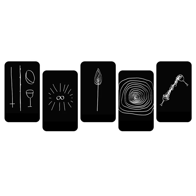 The cards are presented without titles to emphasize their line-drawn symbols. This deck welcomes everyone, beginners and advanced readers alike, but relies on knowledge of the classic Rider-Waite-Smith system. Included in the box is a companion guide that can provide additional guidance. The Portent Tarot can also make an excellent companion deck to enhance readings with more traditional cards.