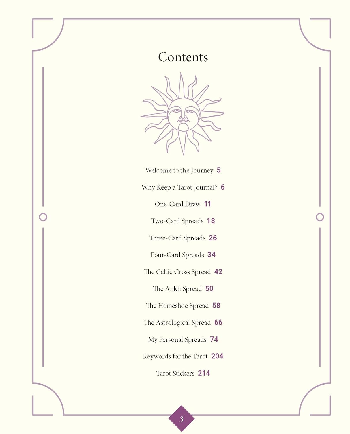 208 journal pages to record your readings and over 1,900 full-color tarot stickers (1 x .6 in.), kiss-cut for easy peeling and application—24 complete sets of tarot cards