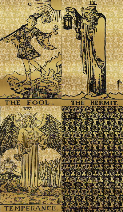 內容物為78張塔羅,帶有金箔色底層由黑色做輪廓展現,內付說明手冊一本。