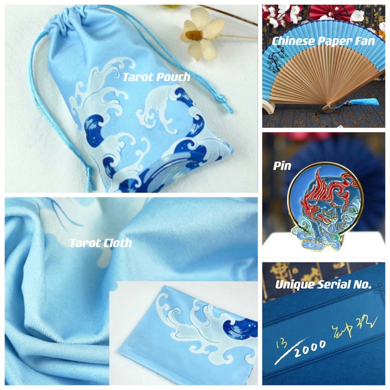 The Limited Edition is numbered and limited to 2000 sets, In the box, it contains a Tarot Deck printed on linen texture card stock with metallic blue edging, a Chinese guidebook, and unique accessories (Tarot Pouch Bag, Tarot Table Cloth, Chinese Paper Fan & Pin).