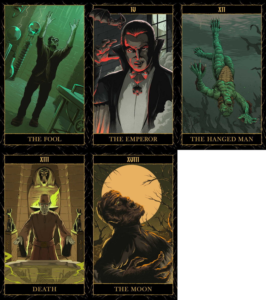78 BEAUTIFULLY ILLUSTRATED CARDS: Each of the 78 tarot cards is a work of art featuring original, detailed images of iconic characters and scenes from films such as Frankenstein, Dracula, The Mummy, The Invisible Man, and more!