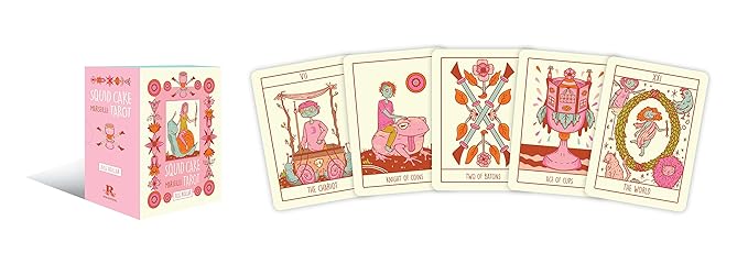 Filled with snails, cakes, fly-traps, and octopus, this deck is a modern and colourful twist on the traditional Tarot de Marseille. The Squid Cake Marseille is a 78 card deck where you'll discover Knights riding creatures, quirky faces and a delicious colour palette! Bring a little light-heartedness to your readings while dishing out the cold hard truth... with a side of humour! Regardless if The Chariot is being pulled by two snails instead of horses, or The Hierophant is giving advice to two pink birds rather than people, the message is still the same.