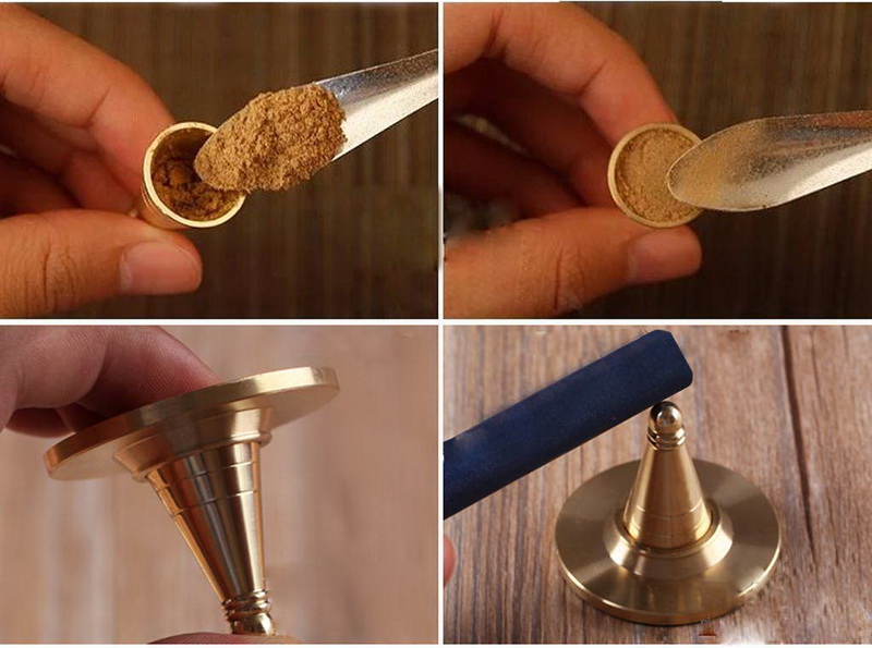 Turn the copper brass upside down, fill the cone with incense powders, use the bottom brass to cover it and then turn back to right side up. Slowly lift the brass cone up, the powder won't fall apart