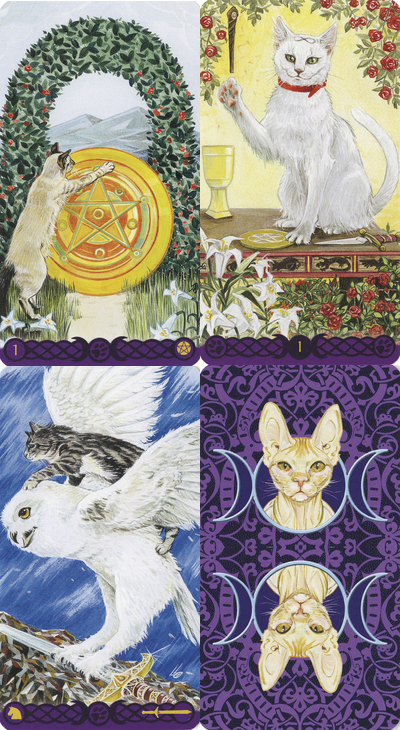 Product Descrpition: Journey with the enlightened feline and welcome their unique secrets. Cats—cute, mysterious, mischievous, or aloof—seem to live in a world between worlds, a realm of magic and power. Access their unique wisdom with this beautifully illustrated deck, featuring traditional Rider-Waite imagery and Pagan symbols.