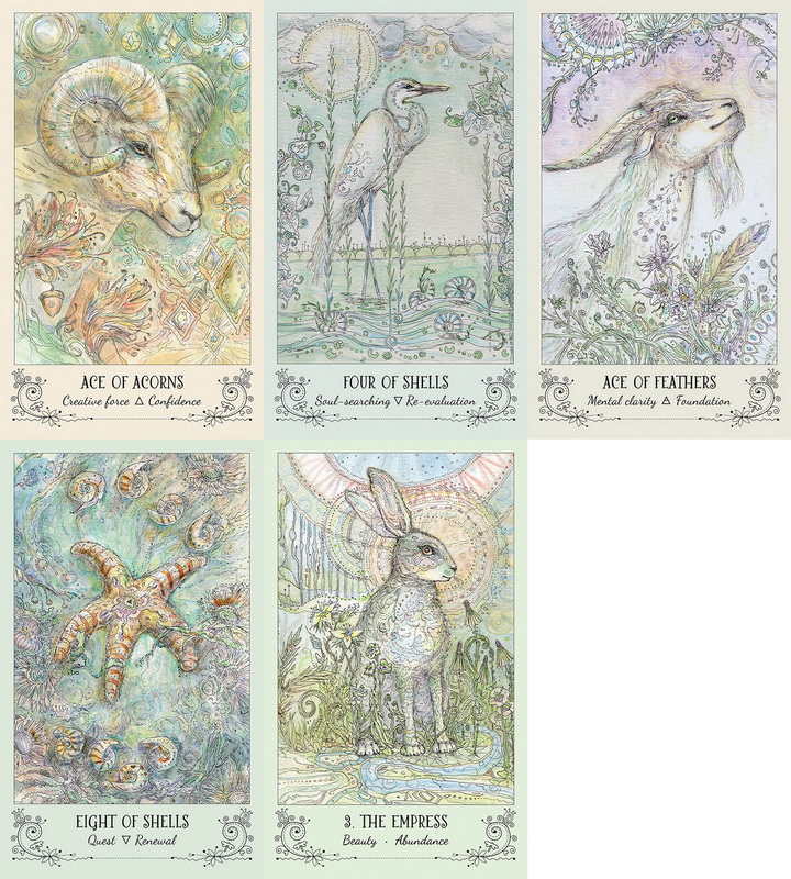 The Spiritsong Tarot structure is based on the traditional tarot, containing the 22 Majors, the 56 Minors, and four suits: Acorns for Wands/Fire; Feathers for Swords/Air; Shells for Cups/Water; and Crystals for Pentacles/Earth.