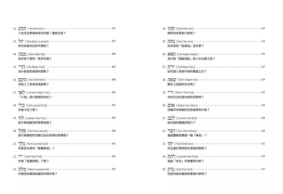 大家的分享,可以如此貼近生活,能給出實用的建議,是因為每一組神之名,其實就代表了你人生中可能面對的議題,或是你對生命的疑問,例如:所有消失的活力都去哪了?如何進入源源不絕的豐盛之流?嫉妒的本質是什麼?為什麼有些人總是心想事成?本書以72個問句,帶出人生中相關的議題,也帶出每一組神之名的能量主題,同時用宇宙運行的法則,解答為何心想事不成的原理,也提供了可以怎麼轉化的方法。